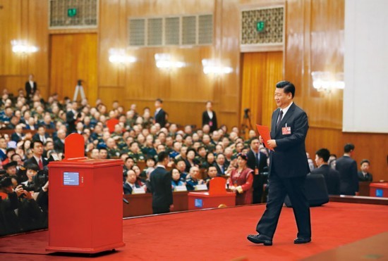 2018年3月17日,十三届全国人大一次会议在北京人民大会堂举行第五次全体会议。习近平当选中华人民共和国主席、中华人民共和国中央军事委员会主席。这是习近平准备投票。 新华社记者 兰红光/摄