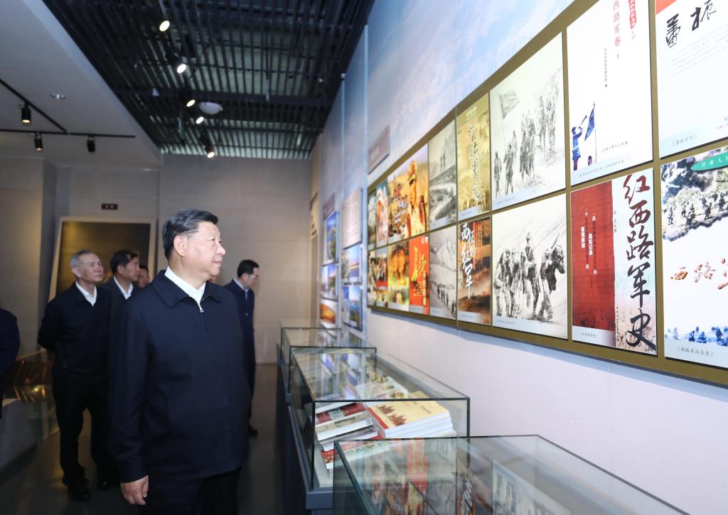 2019年5月20日至22日,中共中央总书记、国家主席、中央军委主席习近平在江西考察,主持召开推动中部地区崛起工作座谈会并发表重要讲话。这是习近平在赣州市于都县中央红军长征出发纪念馆参观,缅怀当年党中央和中央红军在苏区浴血奋战的峥嵘岁月。 新华社记者 谢环驰/摄
