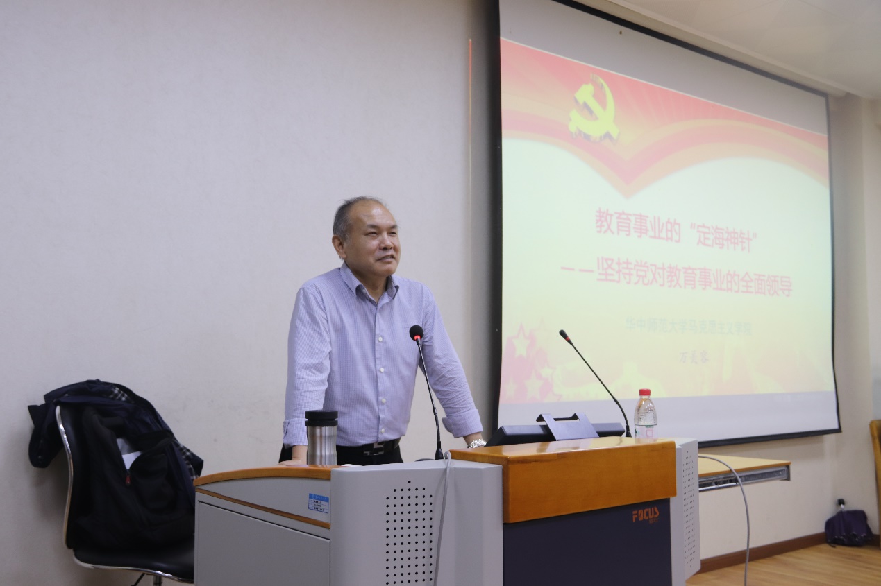 教育学院宣传中心讯(通讯员 白静倩 张萌 编辑 张莉)2020年9月22日晚8:20~10:00,“习近平总书记教育重要论述”必修课第二场专题报告在田家炳502教室成功举办。马克思主义学院院长、博士研究生导师、《习近平总书记教育重要论述》编写委员会成员万美容教授以“教育事业的‘定海神针’——坚持党对教育事业的全面领导”为题做了近两个小时的学术报告。此次专题报告由教育学院党委书记李玲主持。教育学院副院长、博士生导师申国昌教授与教育学院2020级全体研究生参加此次报告。