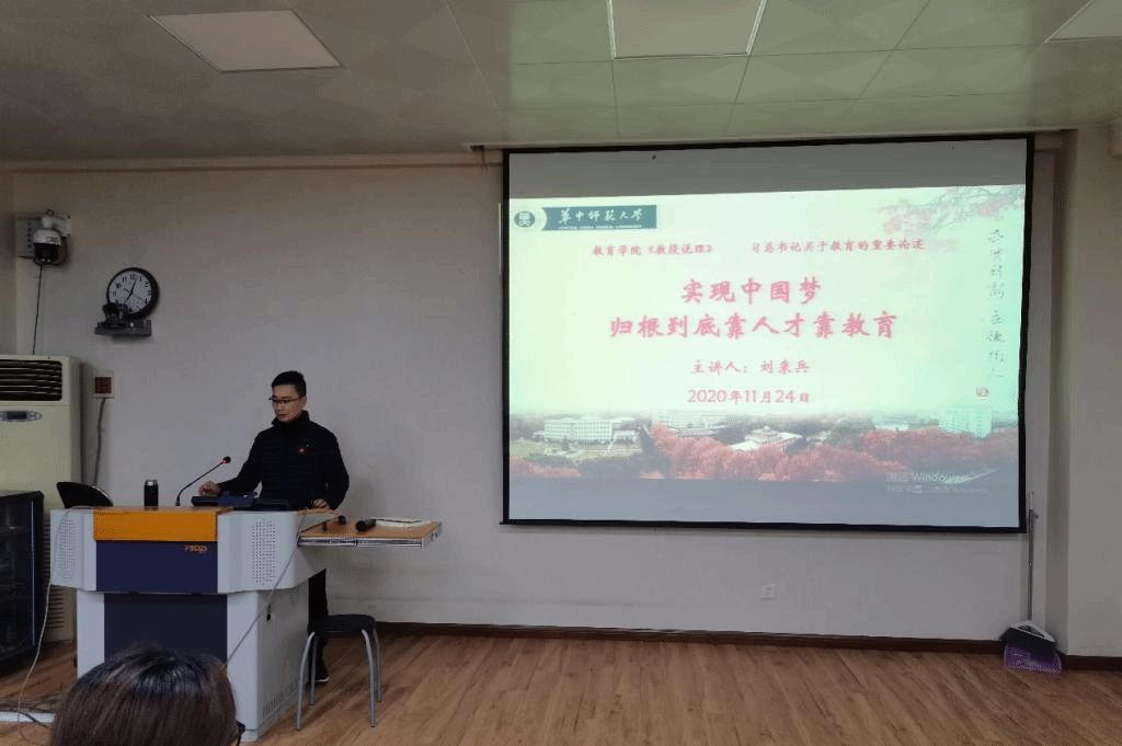 教育学院宣传中心讯(通讯员 白静倩)2020年11月24日晚7:00-8:30,“习近平总书记关于教育的重要论述”第九场专题报告会于田家炳502教室成功举办。我院硕士生导师、刘来兵副教授作题为“实现中国梦归根到底靠人才靠教育——坚持把服务中华民族伟大复兴作为教育的重要使命”的专题报告,教育学院2020级全体研究生新生参加此次报告。