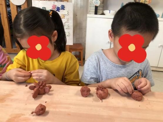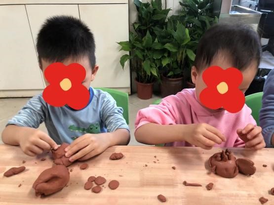 在老师的示范指导下,孩子们揉泥,压泥,泥巴在小朋友的手里“上下飞舞”,不一会儿,经过孩子们细心地搓、黏、柔,孩子们都制作出了拥有自己风格的作品。