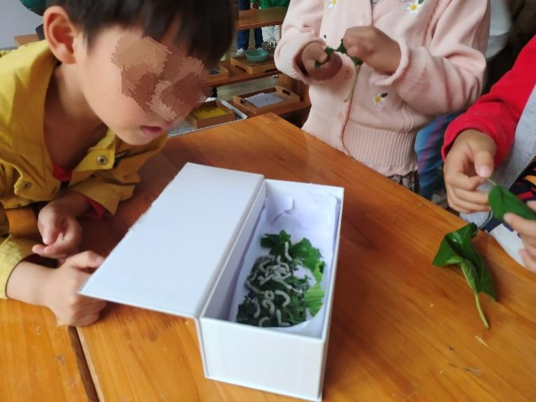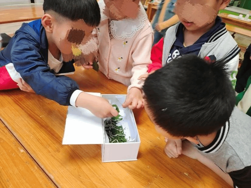 这一周,班级里的一位小朋友带来了蚕宝宝,胖胖的蚕宝宝躺在小小的盒子里,可把小朋友们高兴坏了,大家争着抢着给蚕宝宝喂食桑叶,仔细观察着蚕宝宝每天的变化。为了方便保存,老师还专门在冰箱里留了一块地方放桑叶。每天小朋友们都会为蚕宝宝带来一些新鲜的桑叶,甚至到了周末,家长们争先申请将蚕宝宝带回家亲自照顾。